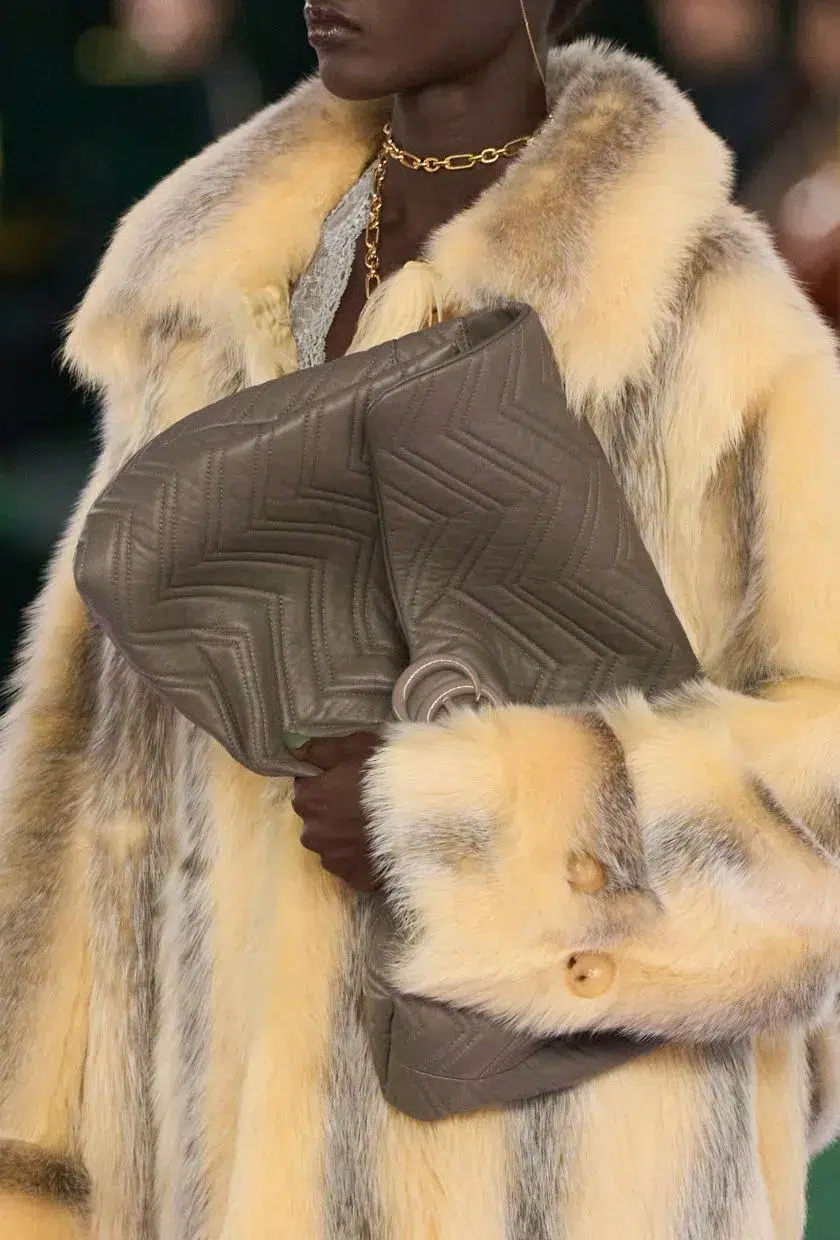 تكتسح خامة الشمواه منصّات العروض هذا العام، لكن بلون مختلف عن البني التقليدي الذي اعتدنا رؤيته. فقدّمت علامات مثل Victoria Beckham وZimmermann حقائب شمواه بدرجات الكاكي التي تجمع بين الأناقة وسهولة التنسيق، ما يجعلها خيارًا مثاليًا لإطلالات الشتاء الهادئة.