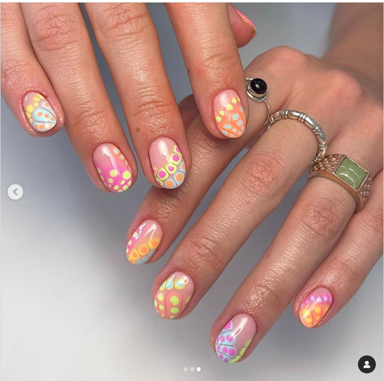 - الأظافر المستديرة: قومي بتنعيم مظهر الأظافر المستديرة باستخدام فن أظافر الفراشة. اختاري ألوان الباستيل للرقة أو الألوان الجريئة للتعبير.