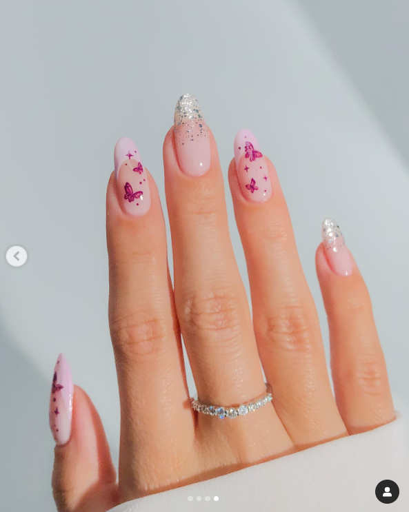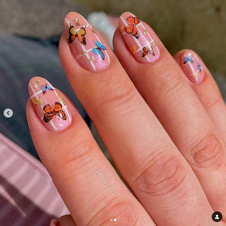 - أظافر اللوز: اختاري فراشة واحدة أو أنشئي أثرًا لتصميم فراشة مرح ليتألق على أظافر اللوز للتأكيد على أناقتها الطبيعية.