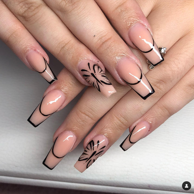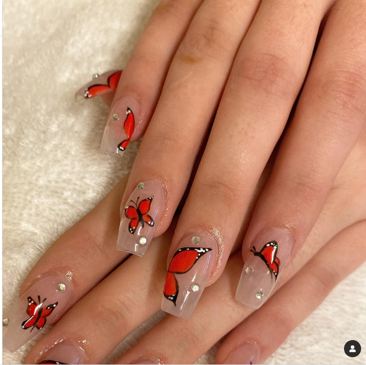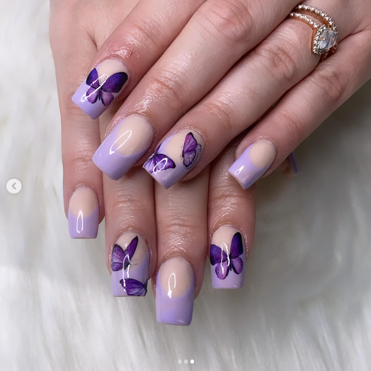 - الأظافر المربعة: اختاري تصميمات الفراشة الجريئة والمعقدة التي تكمل الأظافر ذات الشكل المربع. قم بتجربة الألوان المتناسقة أو النابضة بالحياة للحصول على تأثير إضافي.